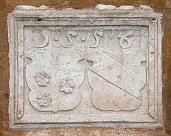 Blasonierung: „Das Wappen zeigt im gespaltenen Schild rechts in Silber eine rote Rose, links in Rot pfahlweise zwei silberne Rosen. Auf dem Helm mit rot-silbernen Decken ein silbernes und ein rotes Büffelhorn.“ |
