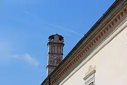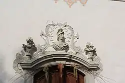 Das repräsentative aus dem frühen 18. Jahrhundert stammende Hauptportal wird von ionischen Pilastern flankiert. Auf dem verkröpften Gebälk stehen zwei große steinerne Schmuckvasen. Auf dem Portalbogen ist das Wappen der Familie Aichelburg aus dem 19. Jahrhundert angebracht. Über das darüber befindliche Fenster ziehen sich Stuckgirlanden empor.