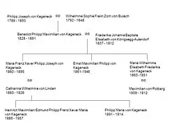 - ↑ Geneall. Die Internet-Genealogie ist nicht vollständig. Zum Beispiel hatte Philipp Joseph außer dem Sohn Benedict Philipp Maximilian vier Töchter. S. Kageneck 1870.
