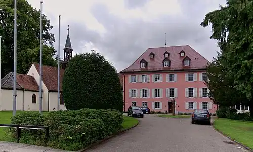 Sie ist das älteste, im Kern mittelalterliche Gebäude des Komplexes. Kirchenrechtlich gehört sie zur römisch-katholischen Pfarrei Herz Jesu der Seelsorgeeinheit Dreisamtal.[21] Von West nach Ost reihen sich das Schiff mit je zwei spitzbogigen Fenstern in den Seitenwänden, der eingezogene, gerade schließende Chor mit je einem spitzbogigen Fenster in den Seitenwänden und eine 1982–1983 angebaute Sakristei.