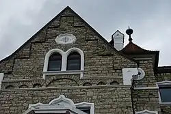- dreigeschossiger Konglomeratsbau mit Risaliten, Erkern und Turmbauten sowie mit Satteldach, Krüppelwalmdach und auf den Türmen Kegel- bzw. Pyramidendach, Kalksteinbossenmauerwerk, gotisierend, Andreas Pfannes, 1897/98, Vereinfachung 1937