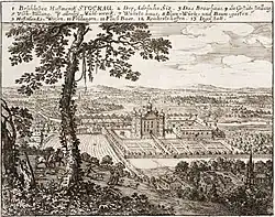 Noch während des Dreißigjährigen Krieges investierte Sandrart große Summen in die Renovierung und Modernisierung des heruntergekommenen Anwesens. Dafür verkaufte er Zeichnungen, Stiche und Gemälde für insgesamt 22.621 Gulden.[6] Er erhielt den Titel eines pfalz-neuburgischen Rates und ein Jahr später die Hofmarksgerechtigkeit.[7] Auf halbem Weg zwischen den Reichsstädten Augsburg und Regensburg und zwischen der Reichsstadt Nürnberg und der Residenzstadt München gelegen, wurde es in dieser Zeit häufig von Adeligen und Patriziern besucht, die Sandrarts Gemälde, Zeichnungen und Stiche besichtigten und sich nicht selten von ihm porträtieren ließen.[8] Der prominenteste Besucher war der Bruder des Kaisers, Erzherzog Leopold Wilhelm, der Stockau im Jahr 1646 einen Besuch abstattete, nachdem er am Hof des bayerischen Kurfürsten Maximilian I. die Bilder gesehen hatte, die Sandrart Anfang der 1640er-Jahre für diesen gemalt hatte.[9] Ein Jahr vor Kriegsende wurde Stockau 1647 durch marodierende französische Truppen verwüstet, woraufhin Sandrart es erneut aufbaute, nachdem der Herzog auf sein Rückkaufsrecht verzichtet und Stockau in ein Allodialgut umgewandelt hatte.[10]
