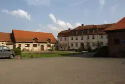 Südöstlich befindet sich ein Wirtschaftshof mit einem elfachsigen barocken Herrenhaus (Gutshaus), einem fünfachsigen Mittelrisalit und einem gegenüberliegenden Torbau mit zwei quadratischen Eckhäusern (Wachpavillons) mit geschwungenem Mansardwalmdach. Sie sind von Nord nach Süd im Verbund mit weiteren Wirtschaftsgebäuden ausgerichtet und bilden im Osten in einem Bogen ein geschlossenes Areal, das nur zum Schloss nach Nordwesten hin eine offene Fläche aufweist.