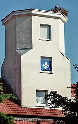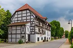 Gegenüber dem Schloss steht ein schlichter, verputzter Ziegelbau aus dessen Mitte sich ein Turm erhebt. Das Gebäude entstand 1805. In seinem Erdgeschoss befanden sich Pferdeställe, Lagerräume, Remisen und eine Wohnung. Im Obergeschoss war neben der Wohnung des Inspektors auch die Gutsverwaltung untergebracht. Der Dachboden diente als Getreidelager. Der Turm trug früher vorderseitig eine Uhr und war von einem gusseisernen Geländer umgeben. Im Sommer nutzte man ihn bis 1945 als Feuerwachturm. Zur Anpeilung von Bränden wurde in den 1930er Jahren ein modernes Gerät beschafft. In der ersten Hälfte der 1980er Jahre wurde das Gebäude komplett um- und ausgebaut und in seiner äußeren Fassade stark verändert.