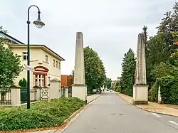 Die Zufahrt zum Schlossbereich wird durch zwei etwa 10 Meter hohe Obelisken markiert. Beide wurden 1996 saniert. Wann sie errichtet wurden, ist bis dato nicht bekannt. Links an der Zufahrt zum Schlossbereich befindet sich die als Witwensitz der Familie von Houwald im Jahre 1886 erbaute, sogenannte Villa. An ihrer Stelle befand sich bis dahin das „Neue Haus“. Dieses im 18. Jahrhundert errichtete, zweistöckige Gebäude mit Mansardenwalmdach diente ebenso als Witwensitz und war baufällig geworden. Der kleine Turm der Villa wurde bei einer Sanierung um seine schiefergedeckte Turmspitze eingekürzt. Im Gebäude sind heute Arzt- bzw. Zahnarztpraxen untergebracht.