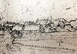 Eine wohl zwischen 1565 und 1585 von Hans Bock d. Ä. angefertigte Stadtansicht Sulzburgs zeigt, dass es sich bei dem ältesten, unter Markgraf Ernst I. seit 1527 errichteten Schloss um einen langgestreckten Baukörper mit Krüppelwalmdach gehandelt haben muss. Der obere Gebäudeteil muss gemäß der Zeichnung aus Fachwerk bestanden haben.[12] In einem Stich von Matthäus Merian d. Ä. aus dem Jahr 1643 ist dieser durch ein steinernes Geschoss, wahrscheinlich unter Markgraf Georg Friedrich, ersetzt. Merians Darstellung zeigt den heute noch erhaltenen zweigeschossigen Saalbau jedoch dreigeschossig. Dies ist wohl als ein Irrtum zu bezeichnen, denn noch „heute steht ja der nördliche Giebel mit seinen der Größe nach abgestuften Fenstern mit den ursprünglich gotischen Gewändern…“[13]