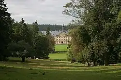 Der 1786 fertiggestellte Bau entspricht dem verbreiteten Schema der Dreiflügelanlage,[1] jedoch in umgekehrter Ausrichtung. Während die Seitenflügel für gewöhnlich auf der Empfangsseite einen Ehrenhof umschließen, sind sie hier zur Gartenseite hin ausgerichtet. Dies erklärt sich möglicherweise daraus, dass der schlichtere Westflügel als Wirtschaftstrakt nicht zur Schauseite zeigen sollte. Straßen- wie parkseitig ist die mehr als 100 Meter lange Front des Mitteltrakts durch die Fensterreihen dreier Geschosse horizontal und durch den Mittelrisalit, der durch sechs Pilaster in fünf Achsen geteilt wird, vertikal gegliedert. Auf die drei mittleren Achsen des Risalits ist ein auf Simsbögen gestelzter Dreiecksgiebel mit Relieffüllung gesetzt. Der Dachfirst darüber trägt einen schlanken Dachreiter mit Zwiebelkuppel und laternenartigem Aufsatz mit goldenem Kreuz.