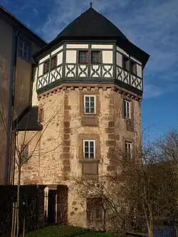Das Blaue Schloss ist bestimmt durch den polygonalen, vierstöckigen Turm auf der Straßenseite des Schlosses, an der nordöstlichen Ecke der Schlossanlage. Er stammt aus der Renaissancezeit und ist im obersten Stockwerk als Fachwerkbau ausgeführt. Bei einem Umbau in Stil des Barocks blieben vor allem die aus Sandstein gebauten, unteren Geschosse, erhalten. Hier sind auf dem Polygonsegment, das der Durchfahrt zum Innenhof zugewandt ist, im zweiten und dritten Stockwerk viel Wappendarstellungen und Inschriften angebracht. Die jeweils acht Wappensteine an jeder Seite des Polygonsegmentes stellen die Genealogie von Christoph von Tann (* 1514; † 1575) und seiner Gemahlin Anna von Ebersberg genannt von Weyhers dar. Auf der linken Seite befinden sich von oben nach unten die Wappen folgender Familien: THAN, MANSBACH, STEIN, TRVBENBACH (Trümbach), GORCZ (Görtz), BREN (Brenden), BRON (Brunn zu Münnerstadt) und SCHENCK (Schenk zu Schweinsberg). Auf der rechten Seite folgen die Wappen WEYARS, MERLAW, WEYERS, LIDERBACH, KETTEN, STEINROCK (Steinau genannt Steinrück), VÖLCKERSHAVS und ROLCZHAVSEN.