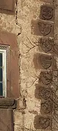 Auf dem Polygonsegment, rechts von diesen Inschriften befindet sich noch unter dem Fester im dritten Stockwerk ein unbeschriftetes und undatiertes Wappen der Familie von Ketten.