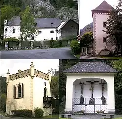 Schloss Thörl mit Torturm, Jägerturm und Kreuzigungsgruppe