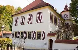 - Zweigeschossiger Walmdachbau mit polygonalem Treppenturm, 1709–13 nach Plan von Johann Ulrich Mösel; mit Ausstattung