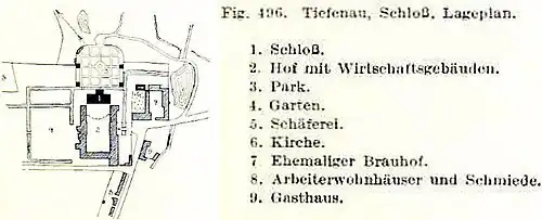 Der Tiefenauer Barockgarten wurden zwischen den Jahren 1705 und 1710 nördlich des Schlosses angelegt und war von ihm nur durch einen Graben getrennt. Geprägt wird er von einer drei Meter hohen Mauer, die das Gelände an drei Seiten umschließt. Hier sind auch vier eingeschossige mit Mansardendächern versehene Gartenpavillons zu finden. Bemerkenswert ist der Grottenpavillon, in dem sich ein strukturierter Grottenraum befindet. Die Gartenanlage wurde mit Wegeachsen symmetrisch angelegt, in ihn sind fünf Brunnen mit Sandsteinskulpturen integriert. Eine Orangerie war der nördliche Abschluss der Schlosshauptachse. Heute sind Teile des ehemaligen Mitteltrakts der Orangerie als Toranlage erhalten.[9]