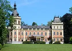 Planung und Bauausführung des im französischen Renaissancestil erbauten Schlosses erfolgte durch den Architekten Heinrich Adam (1839–1905). Zum Areal des Schlosses gehören ca. 20 ha Grund. Die Schlosskapelle wurde 1878–1880 von dem Wiener Architekten Heinrich von Ferstel, dem Erbauer der Votivkirche in Wien, geplant und ausgeführt.