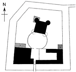 Das Hauptgebäude ist ein dreigeschossiger Bau mit Walmdach. Es besitzt einen nahezu quadratischen Grundriss mit einer Seitenlänge von 16,25 Metern bei einer Höhe von etwa 10,50 Metern.[5] Die beiden nördlichen Ecken werden durch zwei Rundtürme mit einem Außendurchmesser von acht Metern[6] und Kegeldächern markiert. Der westliche von ihnen weist ein quadratisches Erdgeschoss auf. Schießscharten in den Türmen sind heute noch Zeuge von der einstigen Wehrhaftigkeit des Hauses. Die zwei südlichen Pendants der Türme wurden im 18. Jahrhundert abgerissen.