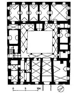 Der zweigeschoßige Säulenarkadenhof hat Kreuzgratgewölbe aus dem 16. Jahrhundert. Eine Säule ist mit einem Akanthuskapitell versehen. An der Ostseite des Hofes ist ein eingestellter Kellerabgang mit einem Rechteckportal. Dieses Portal hat ein floral reliefiertes Gewände, welches mit „1556“ bezeichnet ist.