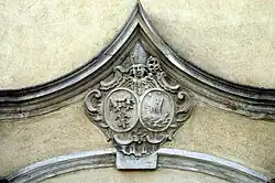 Das profilierte Rundbogenportal an der Westfassade stammt vermutlich aus dem frühen 18. Jahrhundert,[1] die Einfahrt wird durch ein weites Kreuzgratgewölbe abgeschlossen.