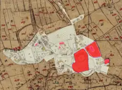 Zwei Pavillons flankieren die östliche Längsseite, die sich zu einem Ziergarten hin öffnet. Von den Ecktürmchen ist hier nichts zu erkennen. Seit dieser Zeit hat sich am Umfang des Schlosses nichts mehr geändert.