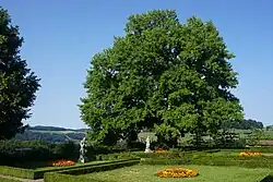 Blick von der Schlossterrasse zum Gehöft Weiher