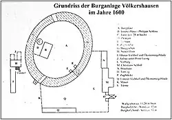 Das Obergeschoss war aus Fachwerk, das einen massiven Unterbau besaß. Eckig und verwinkelt war das Schloss. Amtmänner und das Gutsgericht sowie eine Försterei und später eine Arztpraxis bewohnten das Gemäuer. 1634 haben Horden des Krieges das Gebäude völlig geplündert, aber nicht zerstört. 1706 starb das Geschlecht Völkershausen aus. Das Schloss wurde mit dem Gericht des Landgrafen aus Hessen belegt. 1718 wurde es als Sommersitz eingerichtet. 1815 bis 1847 übertrug man die Herrschaft Weimar. 1875 beherbergte es das Rentamt und die Oberförsterei. 1930 war es ansässig. 1945 wurde es Arztwohnung und Arztpraxis. Der Arzt verließ vor den Truppen der Roten Armee den Ort und Dr. Müller übernahm.