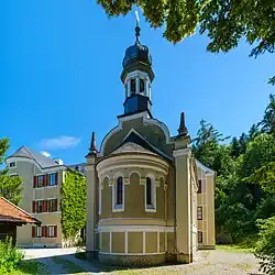 - Schlosskapelle, Satteldachbau mit Dachreiter mit Zwiebelhaube und Putzgliederungen, historisierend, um 1900.