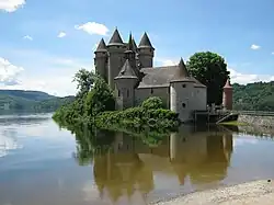 Das Schloss, das einst das Tal der Dordogne von einem Felsvorsprung aus beherrschte, steht seit 1952 auf einer Landzunge, die in den Stausee Barrage de Bort-les-Orgues hineinragt. Nur bei niedrigem Wasserstand ist der ursprüngliche Charakter des Schlosses noch zu erahnen. Der mehrstöckige Bau ist von fünf etwa gleich dicken und einem dünneren, jeweils mit Auskragungen und Kegeldächern versehenen Türmen umgeben. Die einzelnen Etagen sind durch eine Wendeltreppe in der Vorhalle verbunden. Ursprünglich war der Innenhof dachlos. Der erste Stock besteht aus drei großen Räumen mit verzierten Kaminen aus der Mitte des 19. Jahrhunderts und diversem Mobiliar. Im zweiten Stock findet alljährlich eine Kunstausstellung mit Werken von Malern statt, die meist aus der Region stammen. Vom Wehrgang im obersten Stockwerk sind die kunstvoll gearbeiteten Dachstühle der Türme zu sehen.