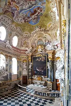 Karl I. von Liechtenstein wurde 1608 in den Fürstenstand erhoben, dies erforderte einen repräsentativen Ausbau des Familienstammsitzes. Der erfolgte im zeitgenössisch modernen Barock, die umfangreichen Um- und Ergänzungsbauten zogen sich bis in die Regierungszeit des Fürsten Karl Eusebius von Liechtenstein.[9] Die ursprünglichen Entwürfe stammen vom Architekten Giovanni Giacomo Tencalla, die Erweiterungen im hochbarocken Stil von Johann Bernhard Fischer von Erlach. Der Fürst investierte in Kunst und Architektur und ihm gelang es, dafür namhafte Künstler zu gewinnen, darunter Baldassare Fontana, Giovanni Battista Innocenzo Colombo und Domenico Egidio Rossi.[10] Das Prunktreppenhaus vom Ende des 17. Jahrhunderts wurde von Domenico Martinelli entworfen, aber nur verkleinert errichtet.[11] Fürst Karl Eusebius ließ eine sieben Kilometer lange Allee zum Schloss Eisgrub anlegen.[12] Er griff damit gestaltend auf die das Schloss umgebende Landschaft zu, was nachfolgende Generationen noch viel intensiver verfolgen sollten. Damit war der Grundstein für die Kulturlandschaft Lednice-Valtice gelegt.