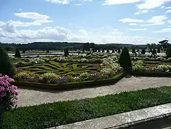 Den Übergang vom Schloss- zum Gartenbereich bilden die Parterres, die durch ihre niedrige Bepflanzung den Blick auf das Gebäude gewähren und durch ihre ornamentale Gestaltung die Motive der Baudekoration wiederholen.[43] Vor dem Nord- und dem Südflügel des Schlosses befinden sich prächtige Broderieparterres, das Parterre du Nord und das Parterre du Midi, die mit ornamentalen Blumenpflanzungen, zahlreichen Prunkvasen und Statuen dekoriert sind. Dem Corps de Logis sind zwei große Wasserbecken vorgelagert, die als Parterre d’Eau bezeichnet werden. In den fünfzehn Bosketten wiederholen sich die Säle des Schlossinneren im Freien.[43] Hier sind mit gärtnerischen Mitteln Salons zwischen Hecken und Bäumen eingerichtet, die man ebenfalls mit Skulpturen, Springbrunnen und kunstvoll beschnittenen Pflanzen ausstaffierte. Zu den bekanntesten Gartenarchitekturen Frankreichs gehört dort die von Mansart entworfene kreisrunde, mit dutzenden Springbrunnen verzierte Kolonnade, und die Salle de Bal (der Ballsaal), seinerzeit berühmt war auch das große Labyrinth von Versailles.