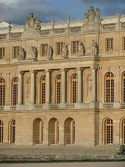 1677 verkündete der König, Versailles zum künftigen Regierungssitz zu bestimmen. Der damit verbundene Ausbau des Palastes begann im Zuge des Friedens von Nimwegen, der Umzug des Hofstaats erfolgte ab dem 5. Mai 1682.[12] Von 1678 bis 1684 wurde die Terrasse des Corps de Logis samt den ihr benachbarten Salons durch Jules Hardouin-Mansart über- und umgebaut und die Spiegelgalerie, sowie die Salons des Krieges und des Friedens installiert. Die ursprünglich waagerechten Fensterabschlüsse des ersten Stockwerkes wurden durch Rundbogenfenster ersetzt, die mit den Spiegeln der großen Galerie korrespondierten. Mit diesen Baumaßnahmen erhielt die Gartenfassade des Hauptgebäudes ihre heutige Gestalt.