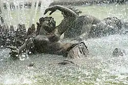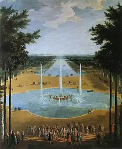 Für die Bewässerung der Parks musste ein System von künstlichen Seen (Étangs de Hollande), Aquädukten und Wasserleitungen entwickelt werden.[52] In der Nähe von Marly-le-Roi wurde unter dem Einsatz Tausender Arbeitskräfte die Maschine von Marly errichtet. Dabei handelte es sich um eine große Pumpvorrichtung, welche die benötigten Wassermassen zum Schloss transportierte. Die den Park versorgenden Rohrsysteme hatten eine Länge von über 160 Kilometern. Trotzdem war eine ausreichende Bewässerung der Brunnen und Bassins mit den damaligen technischen Möglichkeiten nicht gegeben, und die Fontänen konnten nicht alle gleichzeitig betrieben werden. Für die Spaziergänge des Königs wurden immer die Wasserspiele in Betrieb gesetzt, an denen er sich gerade aufhielt. Zum Ende der Regierungszeit des Sonnenkönigs floss das Wasser höchstens zwei Stunden durchgehend.[53] Zu den Glanzzeiten des Schlosses waren mehr als 1.400 verschiedene Fontänen im Einsatz.