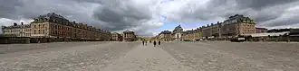 Vor dem Schloss entwickelte sich allmählich die Stadt Versailles, welche ursprünglich ein unbedeutender Marktflecken war. Die Stadtrechte erhielt der Ort, der völlig vom Schloss abhängig war, erst 1787. Die Ansiedlung wurde großflächig auf das Schloss ausgerichtet und in den Gesamtplan integriert. In Gestalt dreier Avenuen, die auf das Schloss und seinen Vorplatz fluchten, wurde ein dreistrahliger Straßenfächer geplant. Lange Alleen führen noch heute durch die geometrisch angelegten Stadtviertel und treffen unmittelbar vor dem Schloss zusammen. Ludwig XIV. unterstützte Bauvorhaben nach besten Kräften und schuf damit das später häufig nachgeahmte Paradebeispiel einer barocken Residenzstadt. Der mehr als 15.000 Personen[15] umfassende Hofstaat unterhielt die gesamte Wirtschaft des Ortes: Köche, Bäcker, Schneider, Tischler und Zimmerer siedelten sich an, und die große Anzahl der Bediensteten lebte in der Stadt. Während dieser Zeit stieg die Bevölkerung Versailles’ auf mehr als 100.000 Personen, sank aber rasch, als der spätere König Ludwig XVI. 1789 gezwungenermaßen nach Paris übersiedelte.