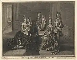 Eine Wohnung in Versailles zugewiesen zu bekommen, war ein bedeutendes Privileg, das zudem die Illusion vermittelte, im Zentrum der Macht an der Regierung beteiligt zu sein. Wer zu den Logeants, den im Schloss Wohnenden gehörte, stand im Rang über den Galopins, den Kutschierenden, die Abends zurück in ihre Stadtwohnungen nach Paris mussten.[25] Innerhalb des Hoflebens übernahm das Hofzeremoniell eine bedeutende Rolle; im Prinzip unbedeutende Hofämter standen symbolisch für politischen Einfluss.[55] Lediglich bei Hofe konnten Posten, Titel und Ämter errungen werden, und wer sich vom Sonnenkönig distanzierte, lief Gefahr, Vorrechte und Rang zu verlieren.[56][57] Aus diesem Grund hielt sich die Aristokratie so gut wie ständig um ihren König auf und versuchte, ihm gefällig zu sein.[58] Das sorgte dafür, dass zeitweise mehrere Tausend Menschen zugleich das Schloss bewohnten.[59]