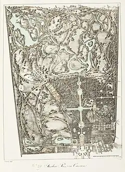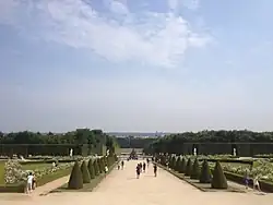 Die Gartenanlagen gehen auf den von Jacques Boyceau de la Barauderie für Ludwig XIII. geschaffenen Petit Parc zurück. Sie wurden in ihrer heutigen Ausdehnung weitgehend in drei Abschnitten von 1662 bis 1667, 1668 bis 1677 und 1678 bis 1689 durch André Le Nôtre geschaffen. Der Schlosspark gliedert sich in drei für alle Barockgärten typische Bereiche: Die dem Schloss nahen Parterres, die anschließenden Boskette und den fernen Jagdwald. Der Bereich der Parterres, der Boskette und des großen Kanals wird noch heute als Petit Parc bezeichnet, der ursprünglich mehrere tausend Hektar große Waldbereich als Grand Parc. Die aus dem Vorbild von Vaux-le-Vicomte übernommene Hauptachse gliedert die Gartenanlagen und führt von der Stadt durch das Schloss, durch den Garten und den großen Kanal bis in die weite Ferne. Der Park wurde durch mehr als 75.000 gestutzte Bäume und Bäumchen verziert,[38] von denen zahlreiche aus den Baumschulen Vaux-le-Vicomtes stammten und zu Fouquets konfisziertem Vermögen gehörten.[42] Bezeichnenderweise blieb der Park in seiner barocken Struktur bis zum Ende des Ancien Régime in weiten Teilen unverändert. Die im 18. Jahrhundert von englischen Vorbildern beeinflusste Umgestaltung vieler europäischer Schlossparks tangierte die Versailler Gärten nur im kleinen Maßstab im sogenannten Boskett der Königin, im Boskett des Apollo-Bades und im privateren Bereich der Trianon-Schlösser. Zur Zeit Ludwigs XVI. wurden Teile des Parks umgestaltet und eine Aufforstung der Boskette vorgenommen. Dafür wurden weite Bereiche gerodet und neu bepflanzt, eine ähnliche Neubepflanzung wurde in den 1990er Jahren vorgenommen.