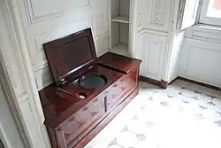 Es gab, wie damals in ganz Europa üblich, im Schloss weder fließendes Wasser noch fest installierte Toiletten. Man verrichtete die Notdurft in Leibstühle und Nachttöpfe, deren Inhalte von der Dienerschaft in bis zu 29 Sickergruben in der Umgebung des Schlosses ausgeleert wurden.[74] Ludwig XVI. ließ sich Frankreichs erstes Wasserklosett mit Toilettenspülung einbauen. Das Schloss hatte wiederholt mit Ratten- und Mäuseplagen zu kämpfen[75] und einmal jährlich begab sich der Hof nach Fontainebleau, damit der Versailler Palast in dieser Zeit von Grund auf gereinigt werden konnte.[76] Der Körperpflege wurde im 17. Jahrhundert zwar noch kein übermäßiger Stellenwert zugeschrieben,[77] doch bereits Ludwig XIV. ließ sich im Untergeschoss des Corps de Logis mehrere Zimmer umfassende Badegemächer einrichten.[14] Im Laufe des 18. Jahrhunderts fanden sich auch zunehmend Baderäume in den Appartements der königlichen Familienmitglieder, während sich die übrigen Schlossbewohner weiterhin mit feuchten Tüchern und Waschschüsseln behelfen mussten.[78]