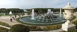 Das Broderie-Parterre im Parterre du Nord bildet eine leicht abfallende Schräge, in dessen Mittelachse am Ende eine Abfolge von Wasserspielen mit einigen der ältesten Wasserbecken und Skulpturen des Versailler Parks liegen: die sogenannte Pyramide und das Nymphenbad. Die Pyramide wurde von 1668 bis 1672 nach Entwürfen von Le Brun von Girardon geschaffen und besteht aus vier übereinanderliegenden Wasserbecken, die von Tritonen, Delphinen und Flusskrebsen getragen werden. Wie viele andere Brunnenfiguren Versailles’ waren auch diese ursprünglich vergoldet.[49] Von hier ausgehend führt die Allee der Marmousetten (auch: Allée d'eau = Wasserallee) nach unten; hierbei handelt es sich um eine Abfolge von je sieben kreisrunden kleinen Becken rechts und links des Weges, in deren Mitte spielende und tanzende Kinder eine Schale aus rosa Marmor halten, aus der Wasser herabrieselt.[50] Auf der untersten Ebene der nördlichen Anlagen öffnet sich ein großes Wasserparterre mit dem Bassin du Dragon (Drachenbecken) und dem großen halbkreisförmigen Bassin de Neptune (Neptunbecken). Das letztere wurde im 17. Jahrhundert von Le Nôtre begonnen, aber erst zur Zeit Ludwigs XV. im 18. Jahrhundert beendet. Es enthält zahlreiche Figuren von Wassergöttern, Tritonen, Seepferden, Delphinen, Seehunden und auf Drachen reitenden Amouretten, von denen insgesamt neunundneunzig Wasserstrahlen ausgehen, die „einen unvergesslichen Anblick bieten“.[51]