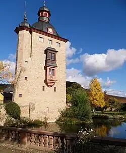 Den Kern des heutigen Schlosses bildet ein als Wasserburg errichteter wuchtiger Wohnturm, der von einem quadratischen Teich umgeben und nur über eine Brücke zu erreichen ist. Er geht auf das erste Drittel des 14. Jahrhunderts und die Familie von Greiffenclau zurück, die Erben der Herren von Winkel waren. Der achteckige Treppenturm, der den Donjon flankiert, wurde 1471 angebaut; der Erker ist eine Zutat von 1620. Über dem Eingang zum Wohnturm prangt das Familienwappen der Greiffenclau.