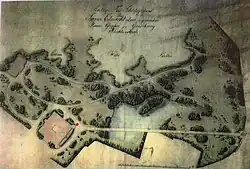 Neben dem Tierpark wurde auch ein Lustgarten errichtet. Er lag nahe dem Wirtschaftshof und dem Schloss, das nach dem Dreißigjährigen Krieg wiederaufgebaut worden war[16]. In dieser Zeit entstand auch der heute noch vorhandene Keller, in dem Gemüse und Früchte als Vorräte eingelagert wurden. Später entstand über dem Keller eine Sommerterrasse.