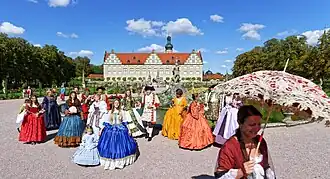 ![]() Höfisches Leben im Schlosspark Weikersheim. Die Kostüme wurden nach Gemälden im Schloss geschneidert. | ||