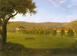Bereits 1230 gründeten einige Dominikanerinnen auf dem Gelände des heutigen Schlosses ein Kloster, welches jedoch 1558 zwangsweise aufgehoben wurde.[1] Im Jahr 1817 ließ König Wilhelm I. von Württemberg auf dem Gelände ein Gestüt anlegen, welches zum einen als Erweiterung des Haupt- und Landgestüts Marbach und zum anderen als Ausdehnung eines Fohlenhofs in Scharnhausen dienen sollte.[2] 1818 errichtete der Florentiner Baumeister Giovanni Salucci im Auftrag des Königs auf dem Gelände ein zweistöckiges Landschloss mit quadratischem Grundriss und je einer Portikus an Vorder- und Rückseite. Dies war Saluccis erstes Projekt im Auftrage des Hauses Württemberg.