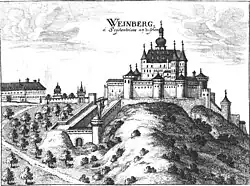 Schloss Weinberg ist eine im Kern gotische Burg, die im 16. Jahrhundert zu einem Renaissanceschloss umgebaut wurde. Die mittelalterliche Burg mit einem rechteckigen, mehrgeschoßigen Wohnturm (26 × 27 Meter) ist im Nordteil des heutigen Schlosses erkennbar. Die Burg war zu Beginn des 14. Jahrhunderts mit einer Ringmauer samt Wehrtürmen umgeben. Am Ende des 14. Jahrhunderts folgte im Osten eine 18 Meter hohe, 3 Meter dicke und 26 Meter lange Mauer, um gegen Angriffe besser geschützt zu sein. Diese Mauer wurde im 17. Jahrhundert umgebaut und dient seitdem als Außenseite für Wohnräume.