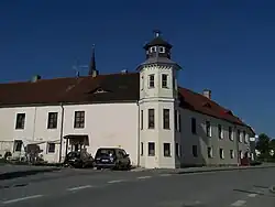 Der L-förmige Flügelbau besteht aus einer barocken, ehemaligen unregelmäßigen Vierflügelanlage. Der zweigeschossige Bau mit Satteldach verfügt südöstlich über ein dreigeschossiges Ecktürmchen, östlich Volutengiebel. Der Bau stammt wie ein angrenzender Stadel mit Walmdach und Blockbauwänden aus dem 18. Jahrhundert.