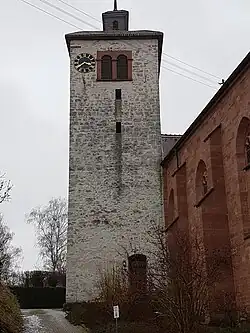 Vom einstigen Schloss ist nur noch der ehemalige Bergfried erhalten, der heute als Glockenturm der katholischen Kirche St. Maria genutzt wird.[1]