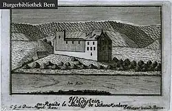 - ↑ Allianzwappen Effinger–von Erlach über dem Hauptportal.