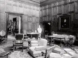 Das Obergeschoss des Seitenflügels war den Gästen vorbehalten. Im Reisebericht von Marie von Bunsen, sie besuchte Schloss Wiligrad im August 1915, wird die Einrichtung der Fremdenzimmer auf der Ostseite des Obergeschosses beschrieben.[46] So beschreibt sie die Wandvertäfelung, die aus Zitronenholz angefertigt wurde und aus einem Potsdamer Prinzgemach des 18. Jahrhunderts stammte. Als Möblierung fanden sich brokatbezogene Möbel aus derselben Zeitepoche.