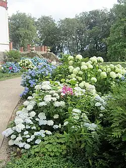 Eine ausladende Terrassenanlage hinter den Wohnräumlichkeiten ermöglicht den Zugang zur Gartenanlage. Hier sind auch die Treppen der Süd- und Ostseite anzumerken, die mit ihren steinernen volutierenden Brüstungen, die bepflanzt sind, ein schmuckvolles Bild bieten. Mittig der absteigenden Brüstung ruhen beidseitig auf einem Sockel große Steinvasen, welche gleichfalls bepflanzt sind.