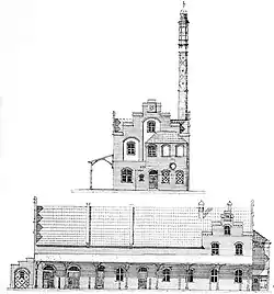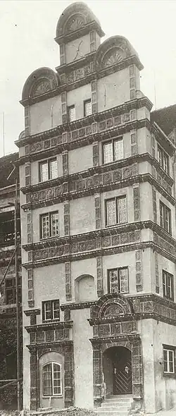 - ↑ Erdgeschoss-Grundriss: 10 m × 10 m; Obergeschoss-Grundriss: 12 m × 15 m, Höhe der Treppenhalle ca. 12,5 m