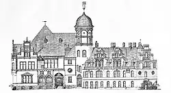 Am Baukörper finden sich die verschiedensten Stilformen. Hier sind die Pilasterordnungen mit Gebälken und Gesimsen anzumerken. Fenster und Türumrahmungen in Terrakotta schmuckvoll gefertigt, welche von alten Bruchstücken historischer Bauten abgeformt wurden.[40] Bemerkenswert sind die runden auskragenden Erker der Westseite, welche den Giebel flankieren.