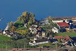 Ansicht vom Etzel auf die Schlossanlage und den Uferbereich des Zürichsees, im Vordergrund die Rangiergeleise des Bahnhofs Pfäffikon