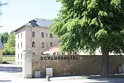 Das heutige Schlosshotel wurde 1859 als Schlosskaserne errichtet. Zuvor befand sich an dieser Stelle die in der Tuchherstellung tätige Grätzel’sche Fabrik. Geleitet wurde der Bau von Kreisbaumeister Carl Heinrich Frühling (1807–1893).[1] In der Kaserne waren die zum Leibbataillon des braunschweigischen Infanterieregiments gehörenden „Schwarzen Jäger“ untergebracht.