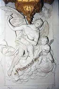 Die Kanzel wird getragen von einem lebensgroßen Engel in Hochrelief, neben dem ein Engelkind ein Spruchband entrollt: