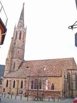 Die Bauarbeiten des ersten gotischen Sakralbaus der Vorderpfalz waren 1335 beendet. Nur wenige Fenster haben Maßwerk, obwohl solches zur Bauzeit schon ein übliches Baudekor war. Als Patronatsherr wird 1387 der Abt von Kloster Schönau im Bistum Worms genannt.[2]